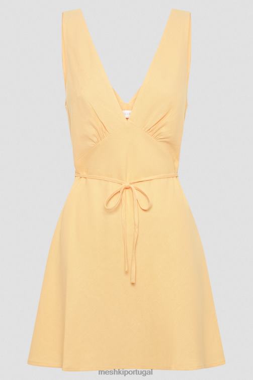 nessa é um minivestido sem mangas com decote em V profundo, bainha solta e crua e corpete com franzidos leves. abaixo do peito. as mangas são largas e a silhueta é suave e casual, criando um lindo estilo de vestir para o dia. a cintura é levemente ajustada para dar mais formato, mas você pode enfatizar ainda mais o corte com a gravata traseira. combine com sandálias de tiras para um look fresco de verão.