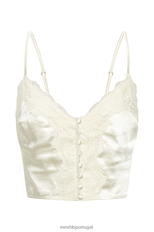 este é um delicado top cami de renda de cetim com alças finas como papel, decote em coração e botões auto-cobertos na cintura. fixação frontal central. o corte simples, porém, é perfeitamente complementado por acabamentos em renda recortada no decote e ajustadores de alça de metal dourado claro. feitos de nossa mistura de malha macia, os elementos de cetim e renda são leves e perfeitos para uso o dia todo. finalize o visual com um par de nossos icônicos jeans tina mom.