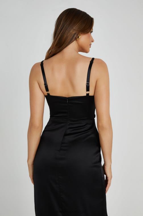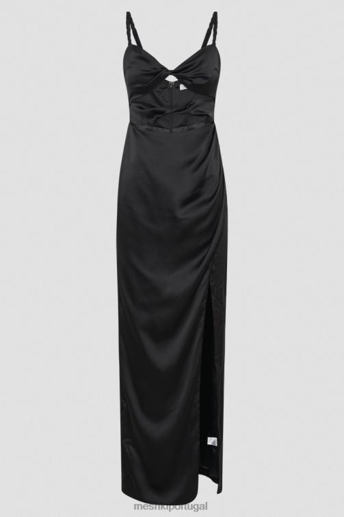cleo é um vestido preto de cetim sexy, sem mangas, com decote em coração e alças ajustáveis. as copas do busto são levemente franzidas e torcidas no centro com uma linha traseira central que fecha através de um zíper padrão de gancho e olho. um painel de corpete torcido fica logo abaixo das copas do busto para criar uma espécie de visual recortado personalizado, enquanto a saia maxi tem uma fenda lateral frontal e três pregas na costura lateral para criar um visual drapeado. as alças são finas e trançadas na frente, dando textura visual ao vestido.