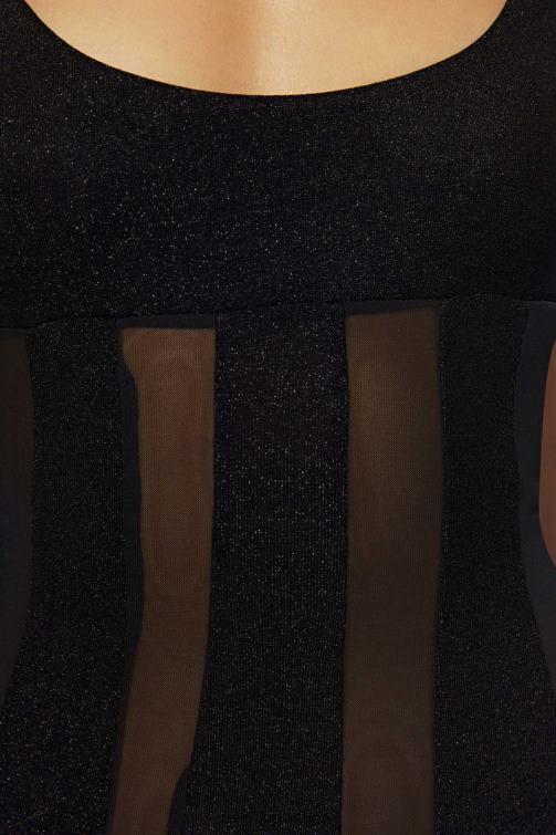 à primeira vista, Dominique pode parecer modesta e moderada. mas se você olhar um pouco mais de perto, verá a natureza brincalhona e sedutora brilhando! feita a partir de uma mistura personalizada de tecido jersey brilhante e malha macia, ela é diferente de tudo que lançamos até agora. o corpo principal do vestido apresenta painéis alternados de material opaco e levemente transparente. ela cria um visual delicadamente texturizado que é sutilmente atraente, não chamativo. alças finas e cruzadas e um ajuste suave e perfeito completam a vibração silenciosamente majestosa de Dominique!